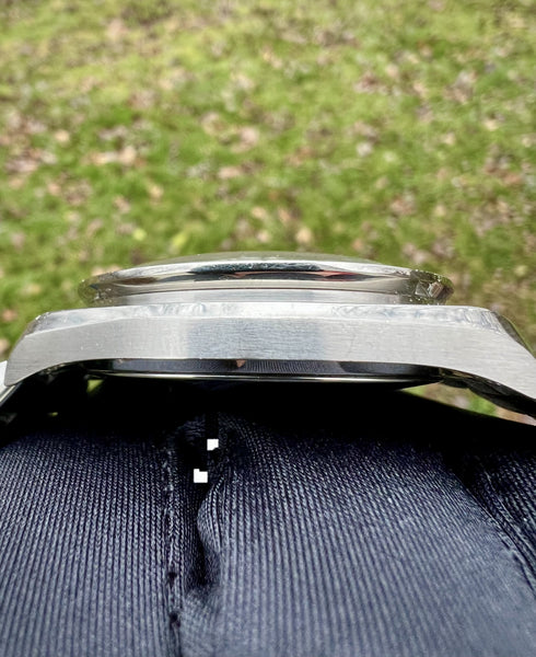 The watch is in good overall condition, with some signs of wear consistent with its age. The bracelet and case show minor scuffs, and the movement requires servicing for optimal timekeeping accuracy.