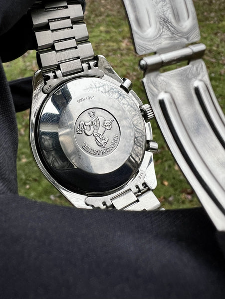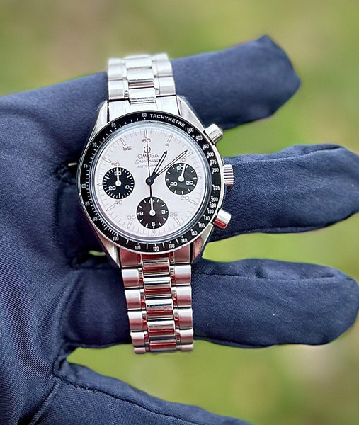 For sale is a stunning example of the Omega Speedmaster Reduced featuring the highly sought-after Marui Panda Dial. This limited and exclusive variation was originally released in the Japanese market, making it a rare and collectible timepiece. The bold panda-style dial offers vintage-inspired charm and timeless aesthetics, reminiscent of iconic chronographs like the Rolex Daytona, but with its own unique Omega flair.