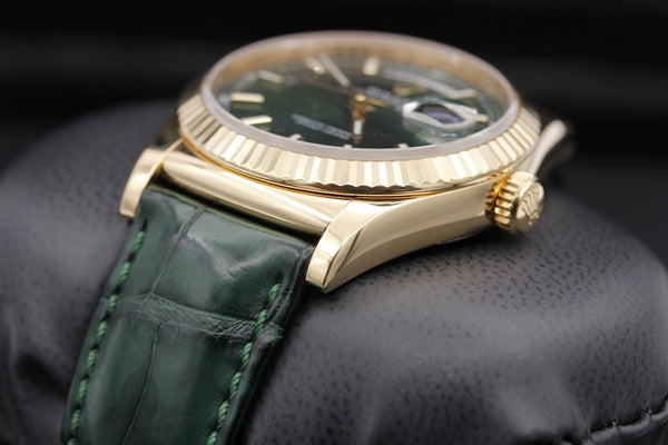 The Rolex Day-Date 36, Reference 118138, is a striking and sophisticated timepiece, featuring a vibrant green dial paired with luxurious yellow gold. Finished with an elegant alligator leather strap, this watch is a bold expression of refined style.