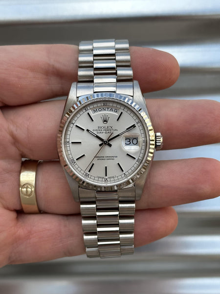 Rolex Day-Date 36 – 18239 – 18k White Gold, Silver Dial, German Day Wheel